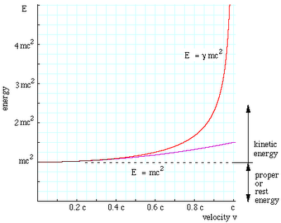 3.Lebih banyak energi yang dibutuhkan untuk menambah kecepatan. Beberapa dari Anda yang tahu sedikit fisika tahu bahwa besarnya energi dari suatu partikel adalah E=mc2. Beberapa dari Anda juga tahu bahwa Energi Kinetik = 1/2 mv2. Tapi saat Anda bergerak mendekati kecepatan cahaya, hal itu butuh dan butuh lagi lebih energi untuk bergerak lebih cepat. Pada grafik di bawah ini, garis ungu adalah formula lama untuk energi kinetik, tapi garis merah merupakan energi yang sebenarnya (relativistic). Catat bahwa Anda tidak akan pernah benar-benar sanggup mencapai kecepatan cahaya, tapi bahwa energi itu mendekati tak terbatas (infinity).